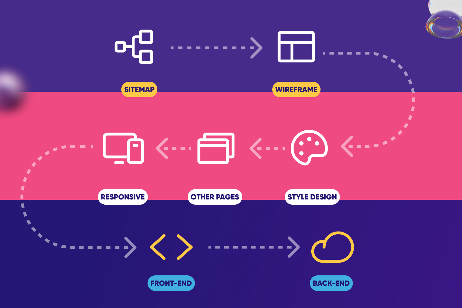 Để hoàn thiện một website, dự án cần đi qua một lộ trình từ cấu trúc sơ khai đến mã nguồn hoàn chỉnh. Quy trình này bao gồm các bước: Sitemap -> Wireframe -> Style Design -> Other Pages -> Responsive -> Front-end -> Back-end. Mỗi giai đoạn đóng vai trò đảm bảo sản phẩm vận hành theo đúng mục tiêu và yêu cầu kỹ thuật đã đề ra.