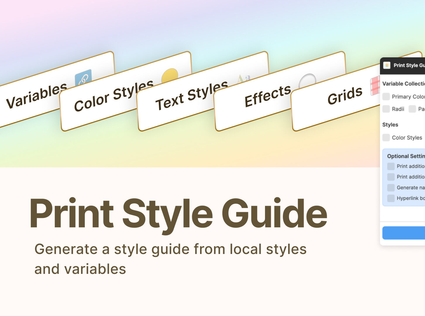 Print Style Guide là một plugin trên Figma giúp bạn export toàn bộ hệ thống style và variable thành một document trình bày rõ ràng. Nếu bạn từng dùng qua plugin “Print Variables” thì có thể xem đây là phiên bản nâng cấp mạnh mẽ hơn – vì giờ đây nó tổng hợp cả styles (màu, text, effect…) lẫn variables trong một lần export.